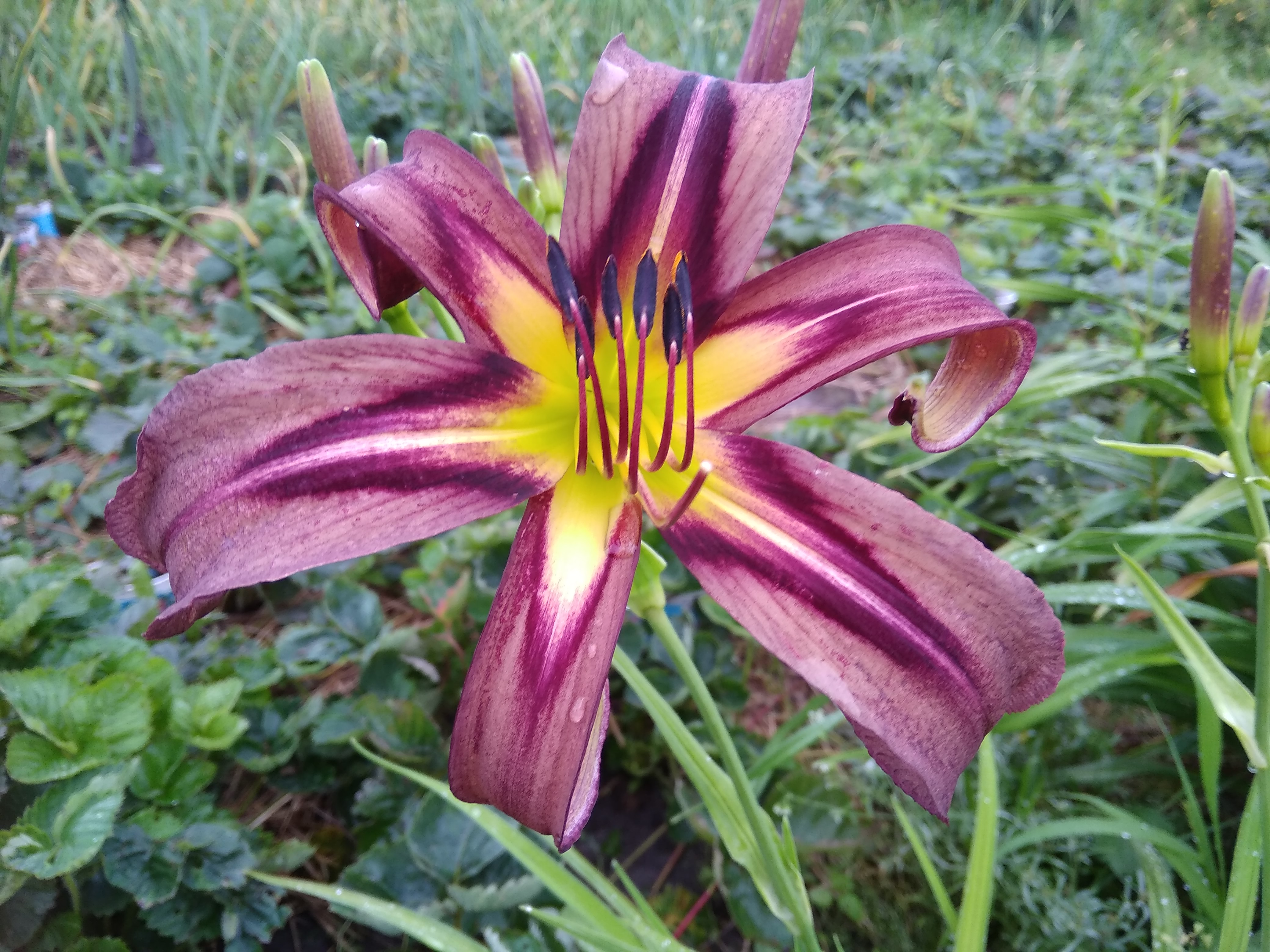 Шоколадно-фиолетовое пятно в виде звезды и темно-лиловый кант. Светлый штрих по центру лепестка.